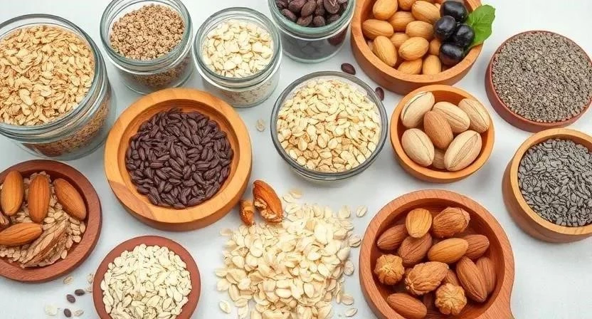 - Орехи и семена (миндаль, грецкие орехи, семена льна, семена чиа)